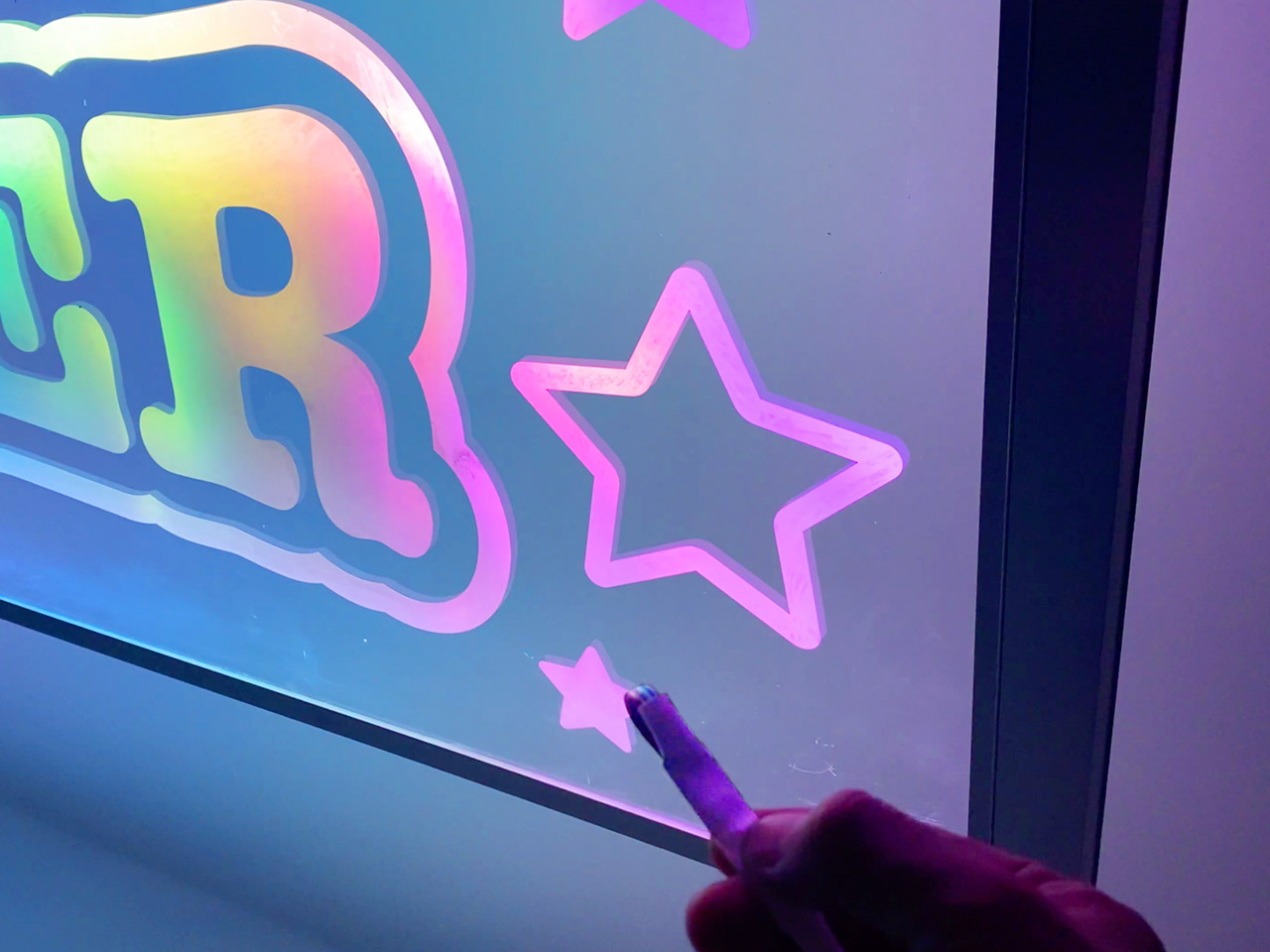 フレームの上下に同期させた細身かつ高輝度なLEDテープライトモジュールをアクリルに通す事で、表面に貼られた白インクジェット印刷シートがRGB発光。