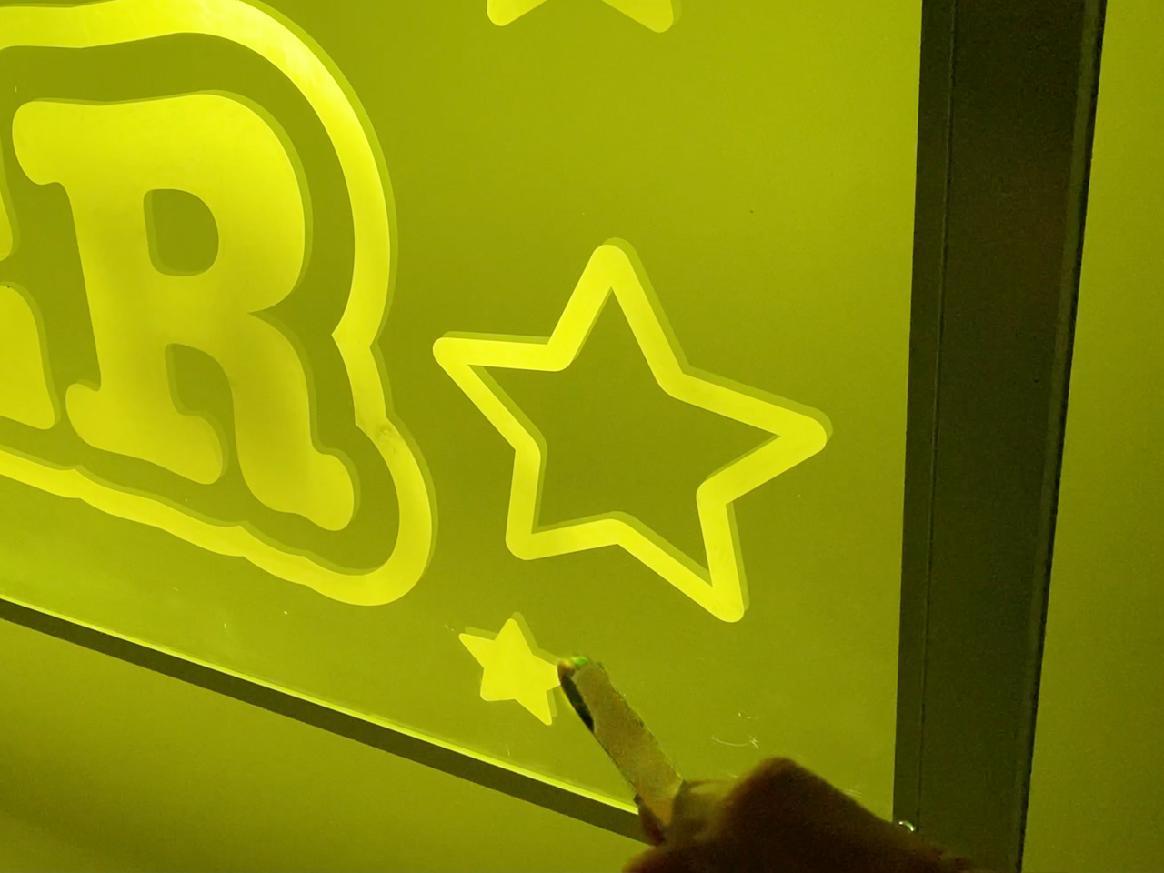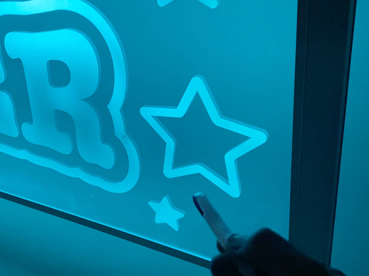 またクリスタルフローの発光方式は、アクリル表面に貼られた乳白色カッティングシート、または透明シートの白インクジェットで印刷された部分が上下LEDからの光を拾って発光します。