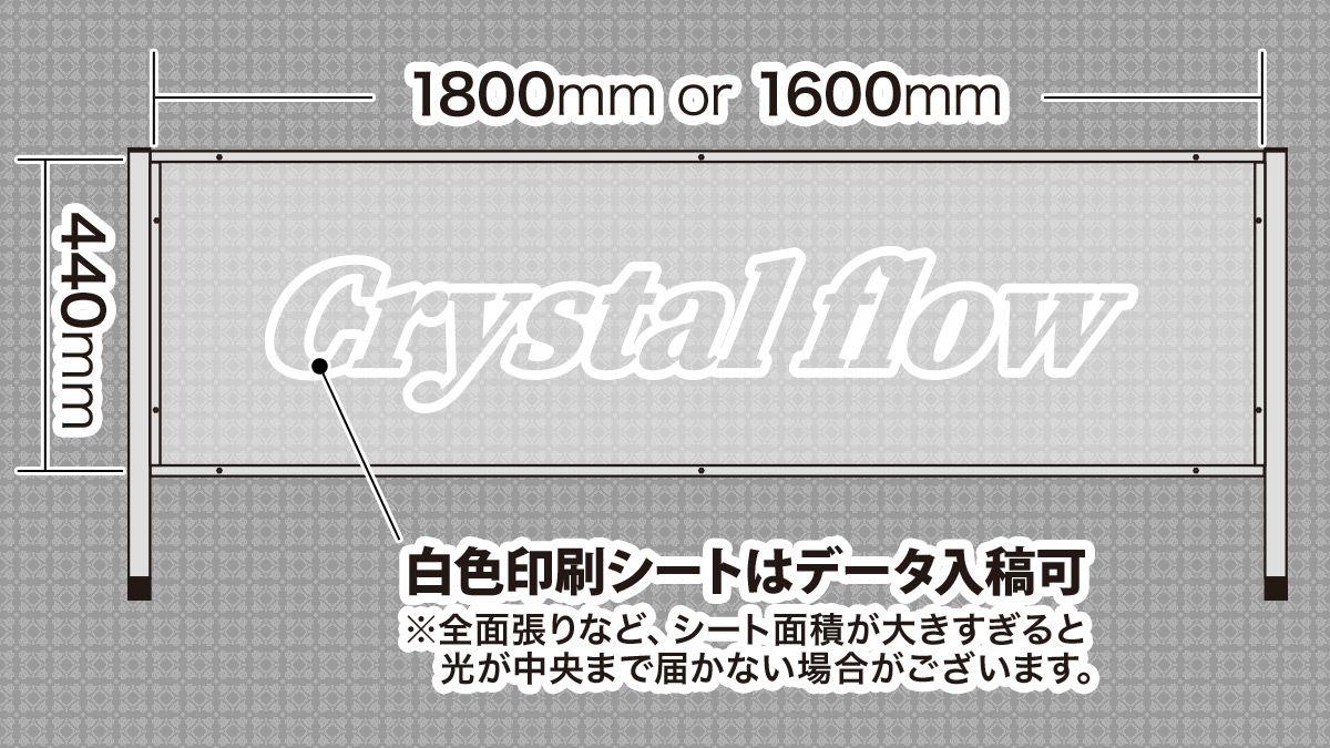 クリスタルフローのサイズラインナップは、アクリルW:1800mm×H:440mmとW:1600mm×H:440mmの2種がございます。