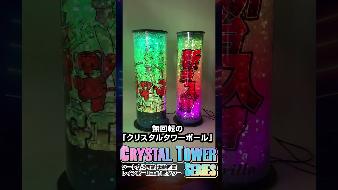 「クリスタルタワーシリーズ」 は、デザインシート交換も可能な、レインボーに光る円筒型のLEDタワー装飾!