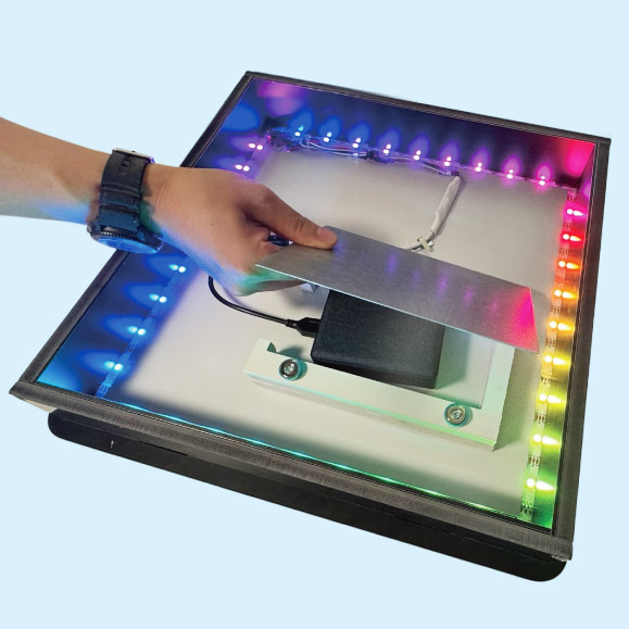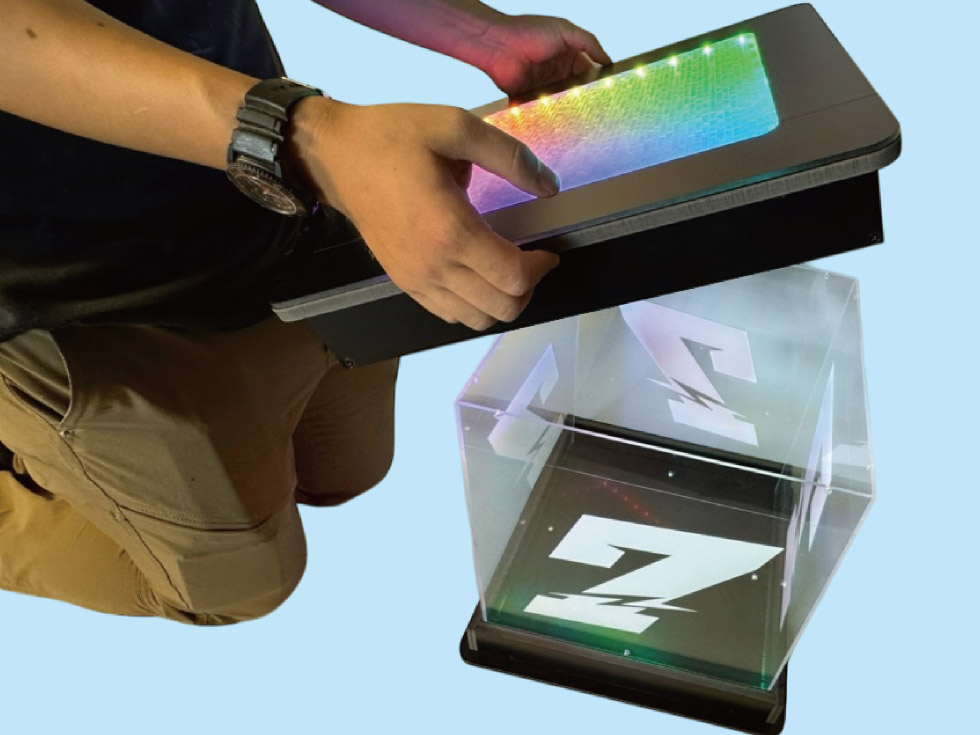 RGB-LEDで、4側面のアクリル板に貼られた白色柄シートと天板部分がレインボーに光る!キャスター付きでドル箱を重ねて出玉をアピール出来る!!