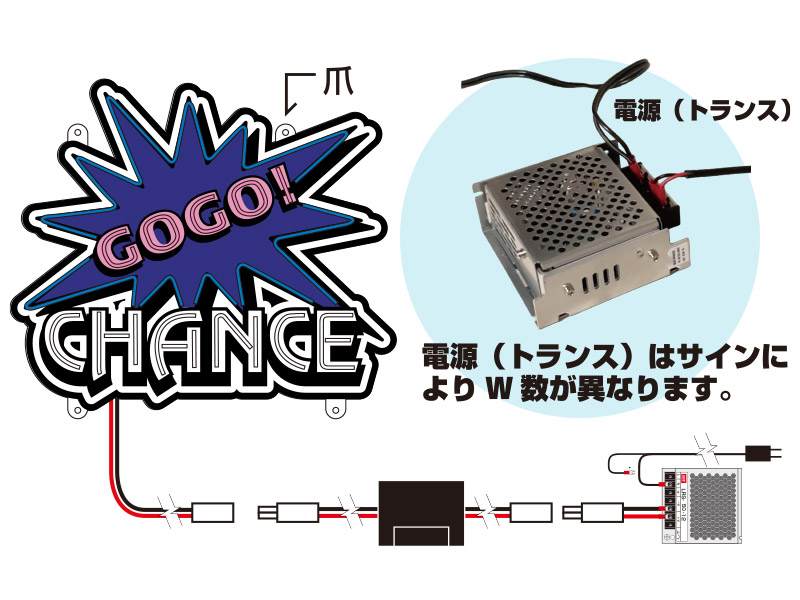 【100Vコンセントタイプ】は、サインから直接コンセントに繋ぐタイプ!設置場所が固定の場合はこちらがよりローコストに導入できます!
