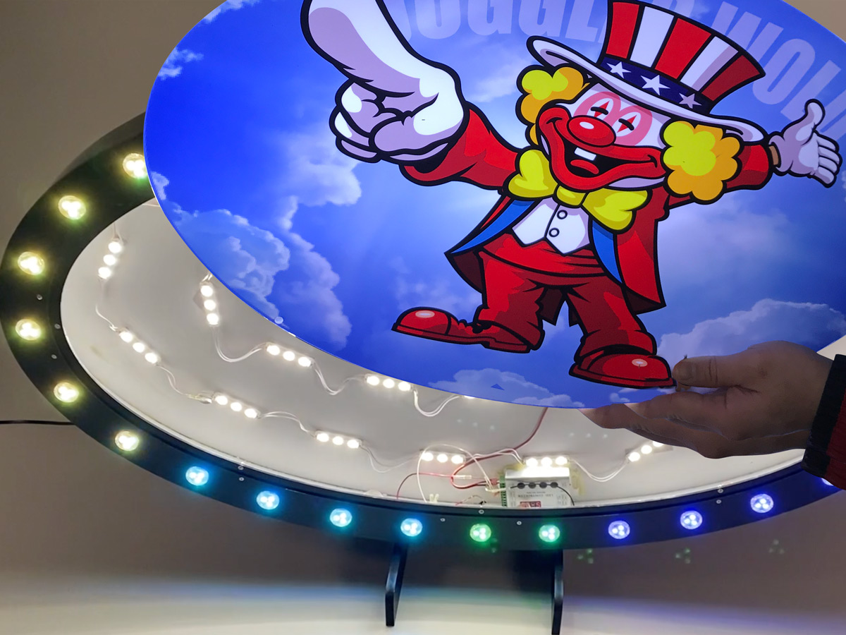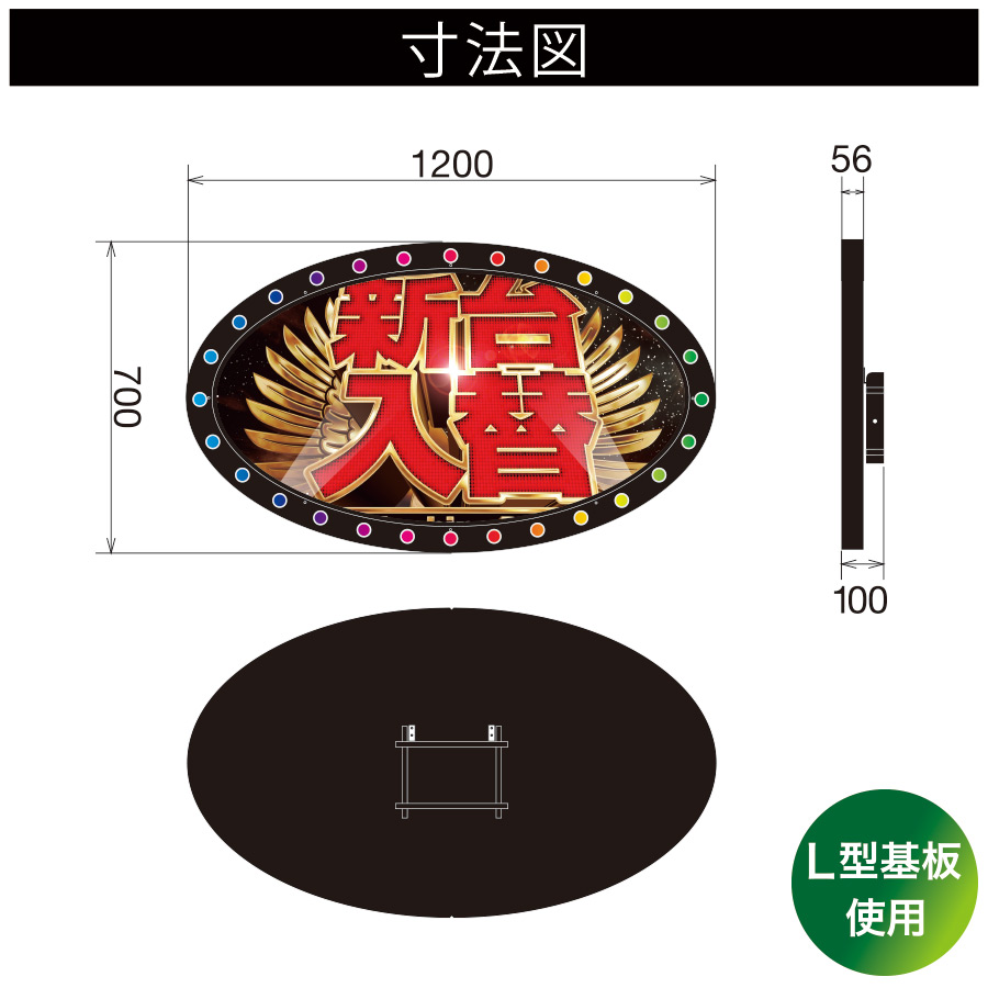 | 商品仕様 | 本体サイズ:W1200mm × H700mm × D56mm(L型基板込み:D100mm) 板面サイズ:直径1078mm × 572mm楕円形 × 2mm厚アクリル × 1枚 本体重量:約3.5kg |