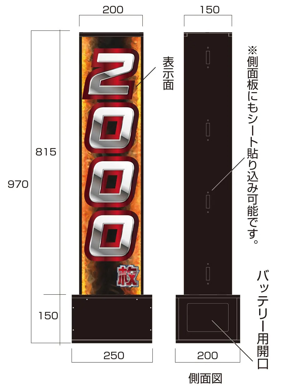 | 商品仕様 | サイズ:W250×H970×D200(mm) 重量:約3.5kg ▽別途指定オプション ・電源タイプ:コンセント電源/モバイルバッテリー・変換コード(両方指定可) ・電飾ペット出力シート 両面(テンプレート/データ入稿) |