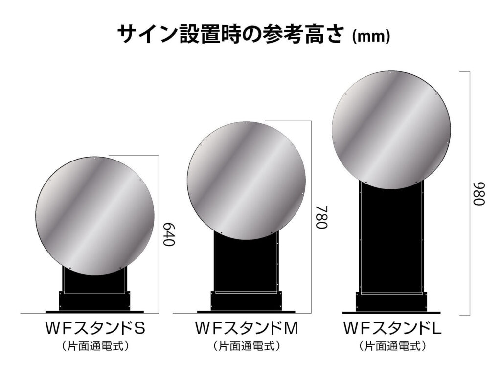 新登場の「WFスタンド」は、スタンドの高さの違いでSサイズ・Mサイズ・Lサイズの3つから選べます。島の上や床置きなど、ホールの様々な場所にLEDサインを設置できるようになります。動画でご覧いただいたように、メインサインやサイドサインなどのユニットゲートから外したLEDサインを置き型サインとして再利用したり、おしゃれなネオンベースやミラーリングサインなどを、壁面のない場所でも置き型LEDサインとして設置できます!